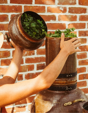 Step 3 Within minutes of harvesting, the young lemon balm tops are placed into a classic copper alembic still. Natural well spring water is heated to create the steam that then passes through the plant material, condensing into hydrosol and filling the greenhouse with its intoxicating lemony aroma.